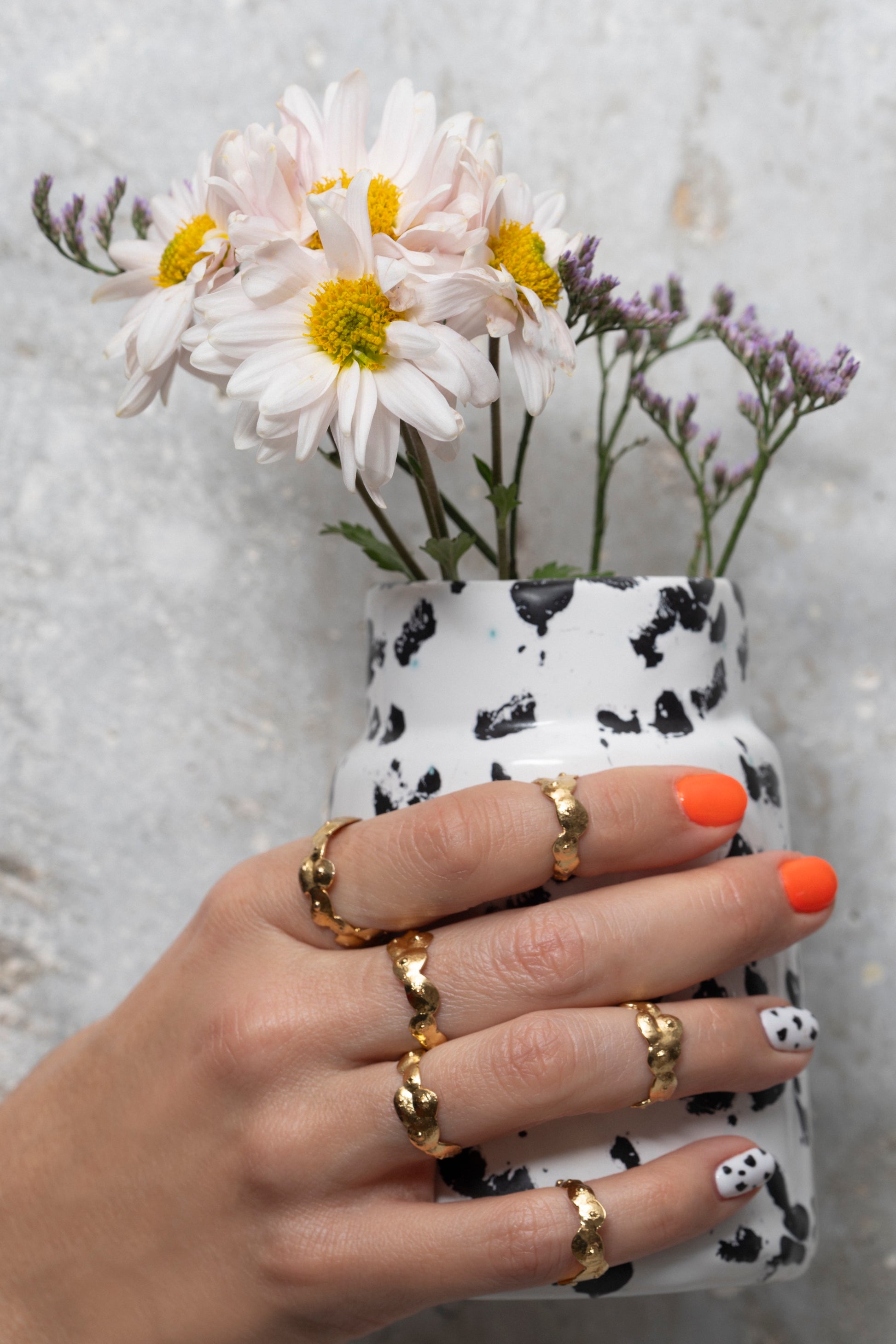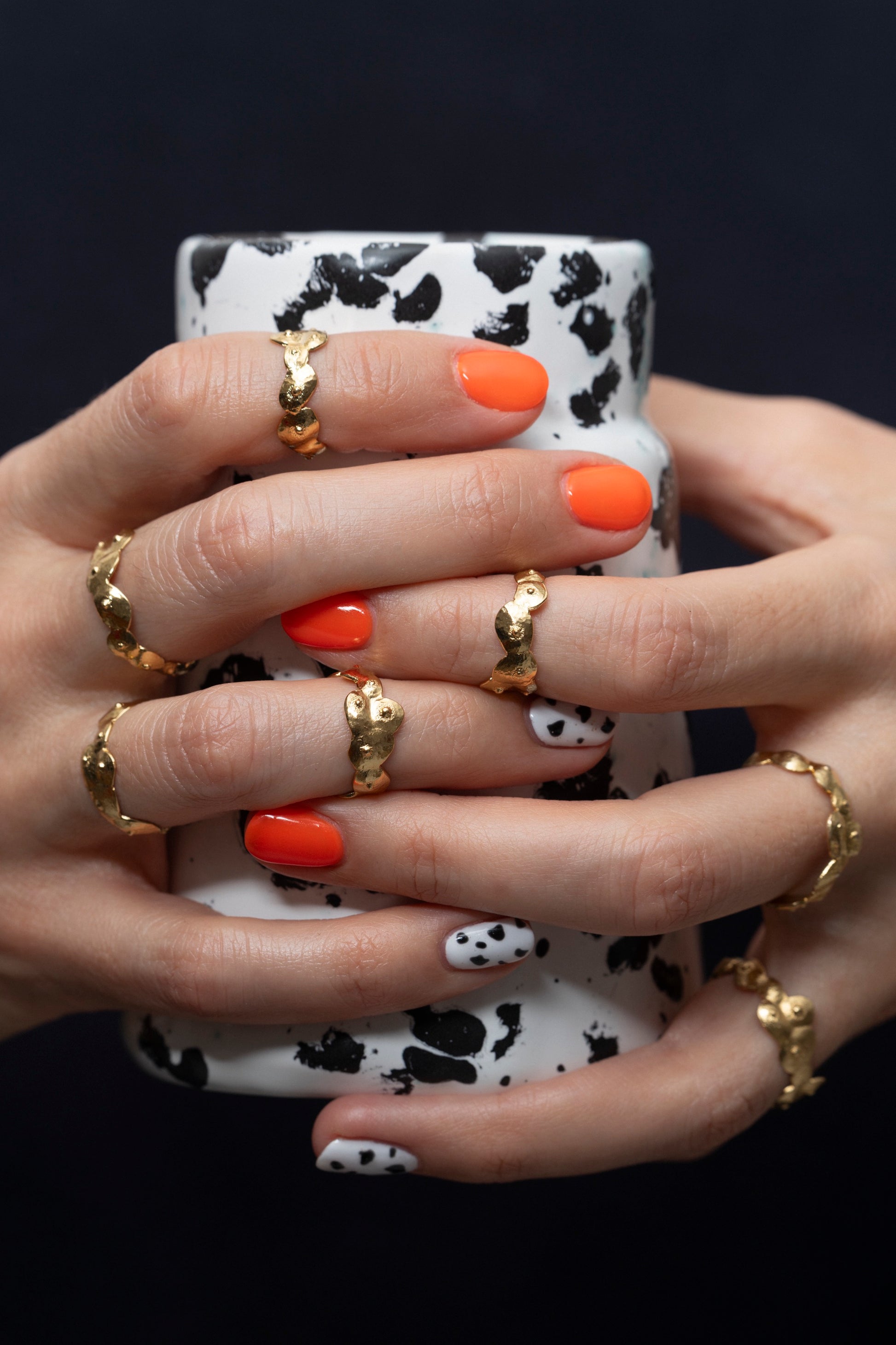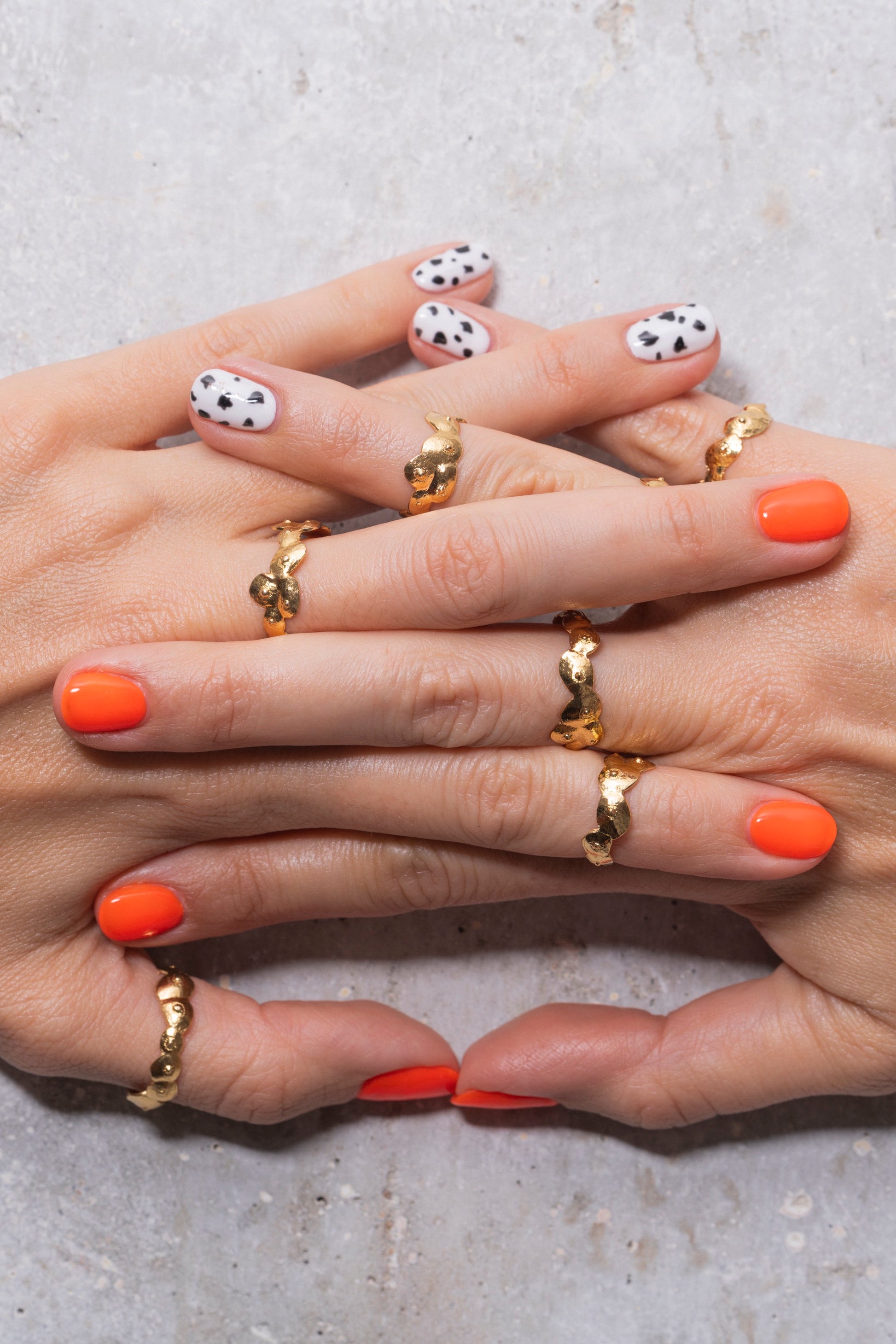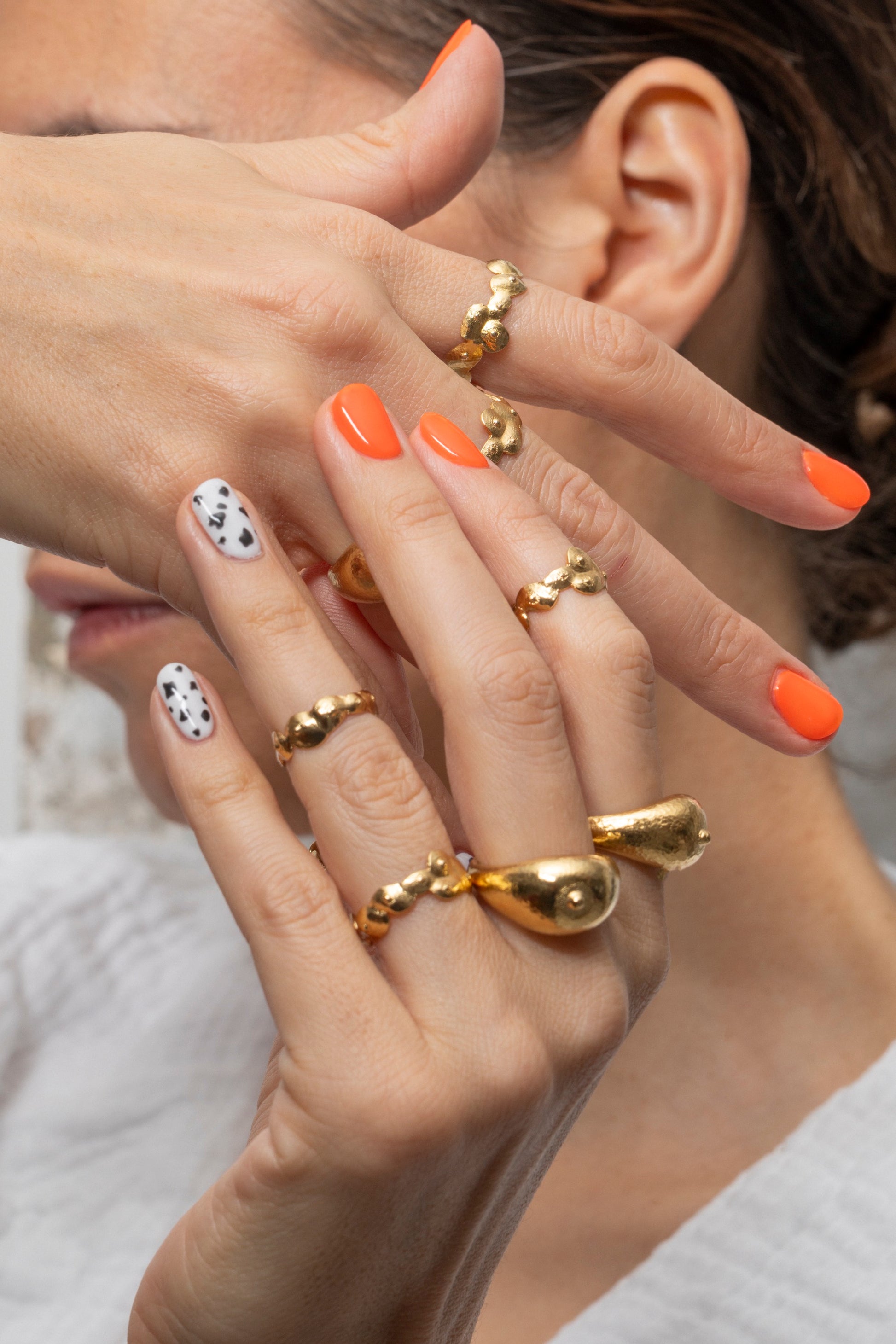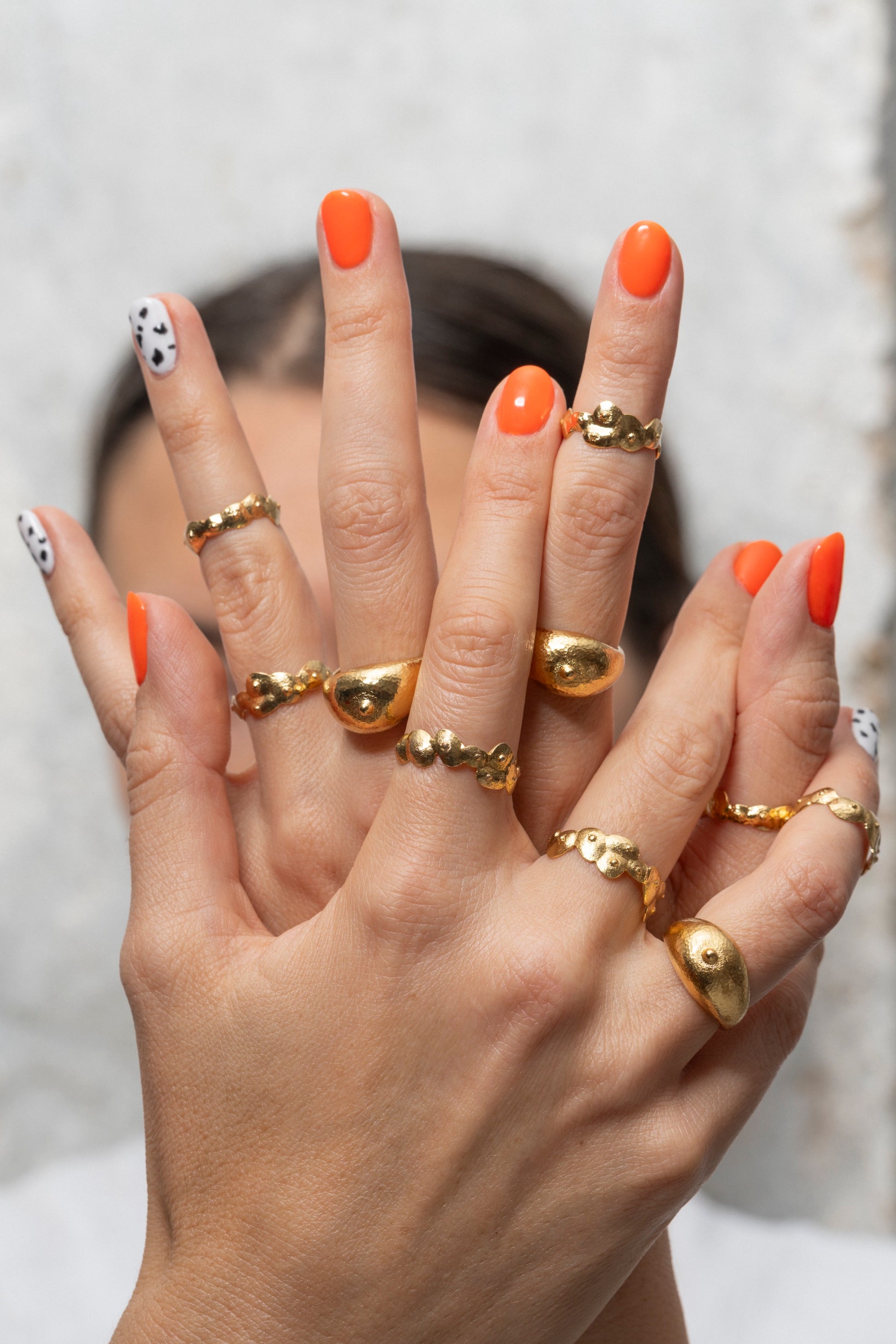 Sculptée à la main en laiton plaqué or poli, cette bague forme une petite couronne de seins stylisés : une pièce sensuelle, décalée et pleine de caractère.