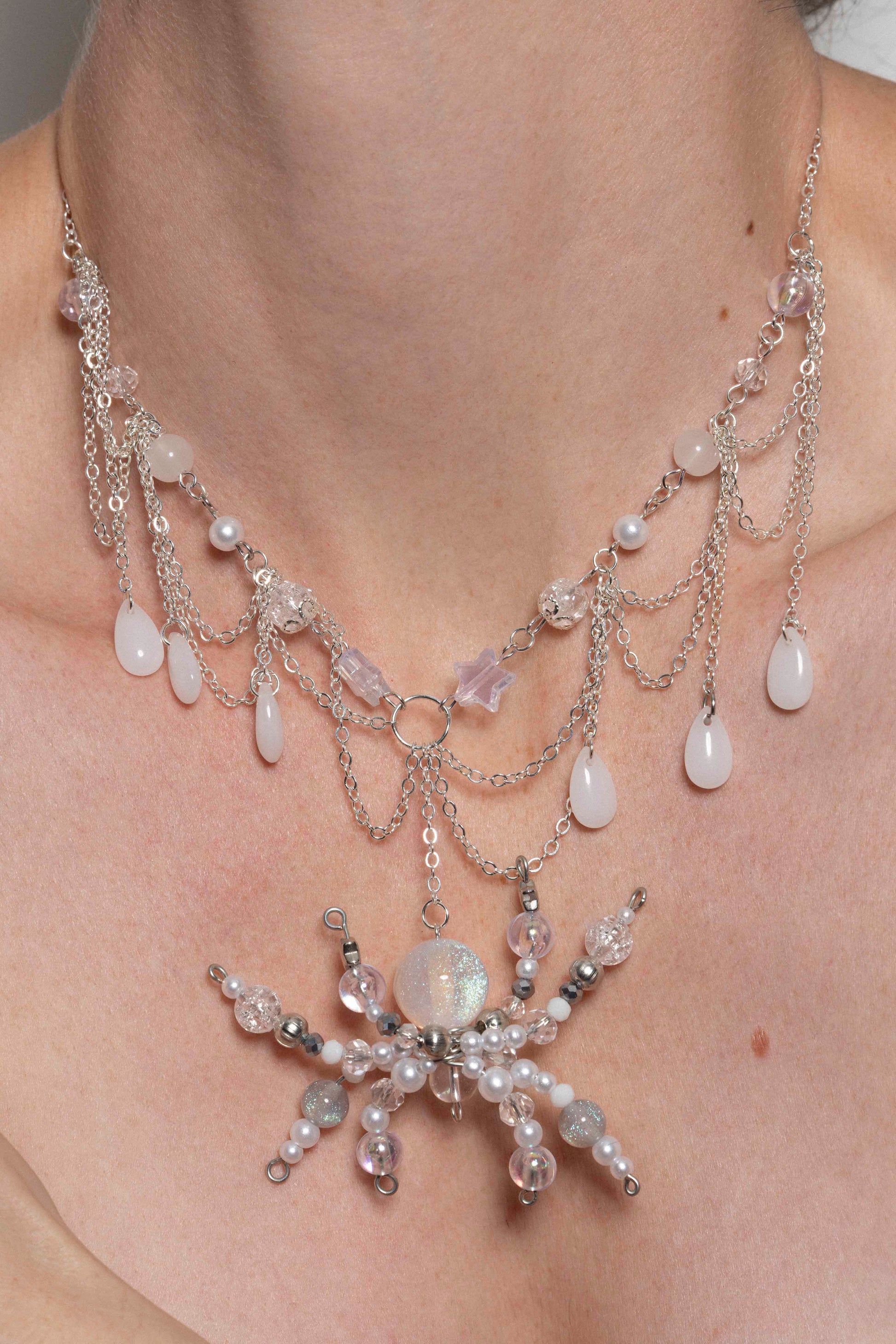 Produit exclusif imaginée et dessinée par Kamiraii, ce collier est une exclusivité du Pink Power Store. Chaque bijou est conçu et façonné à la main. À porter ou à offrir à celleux amoureux des perles et des arachnides.