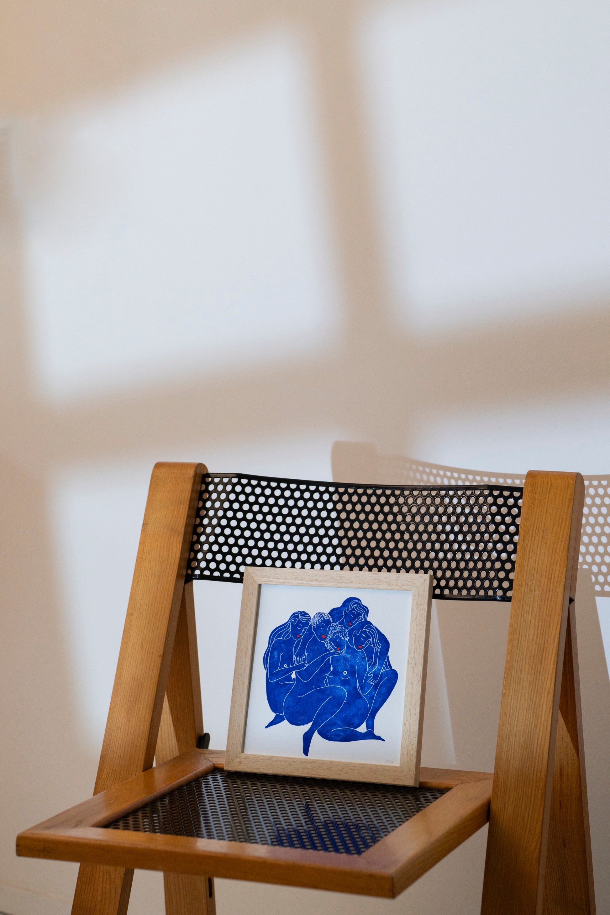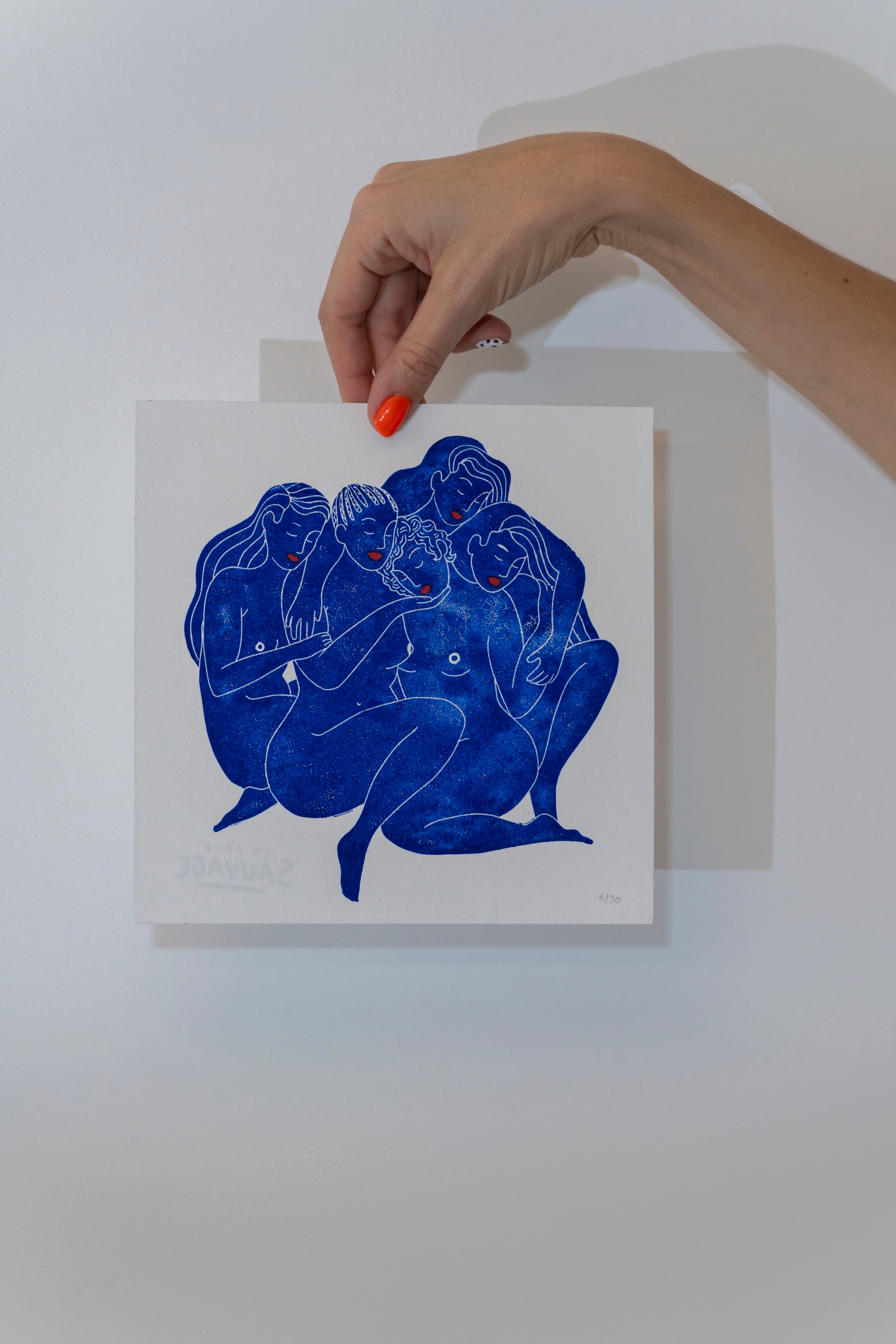 Une illustration douce et sorore, où cinq corps féminins se révèlent dans un bleu profond. La Fête Sauvage apporte, comme toujours, cette délicatesse dans les lignes et cette manière poétique de célébrer la féminité.