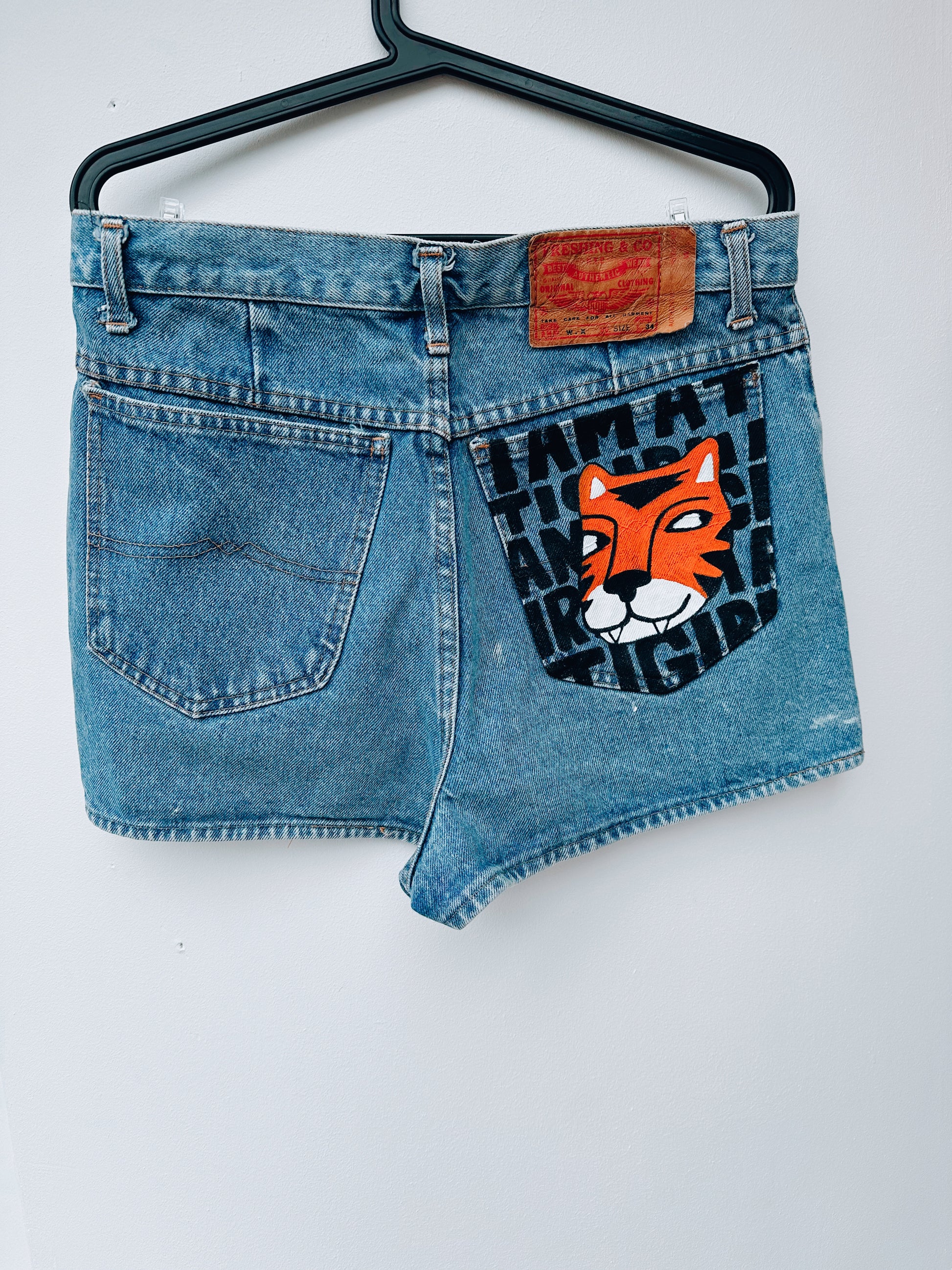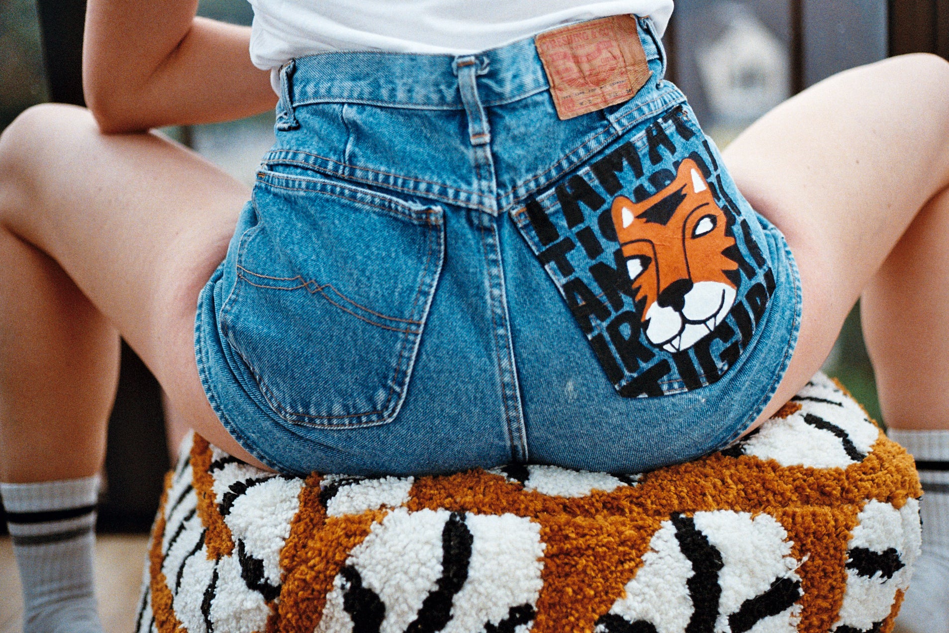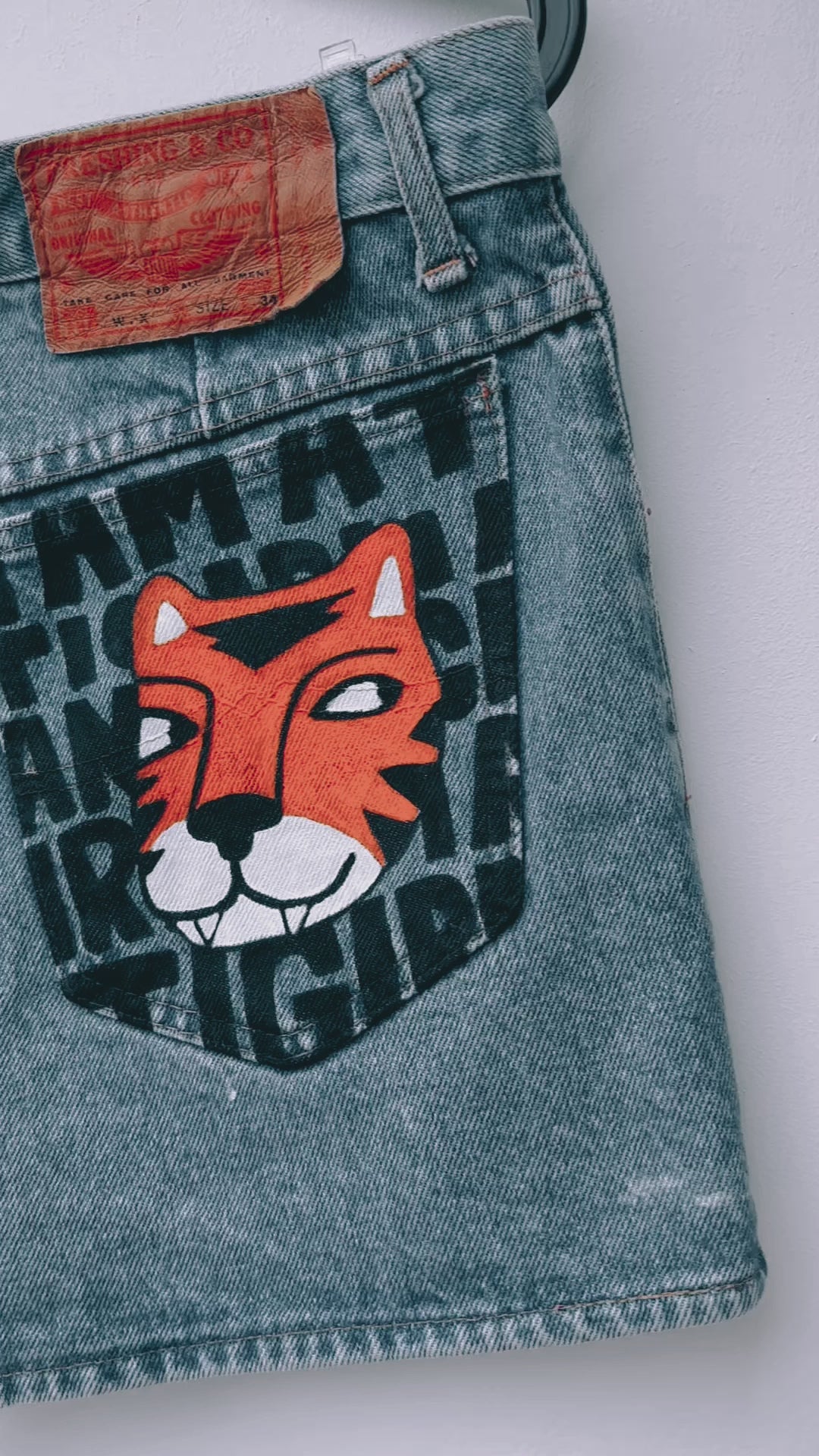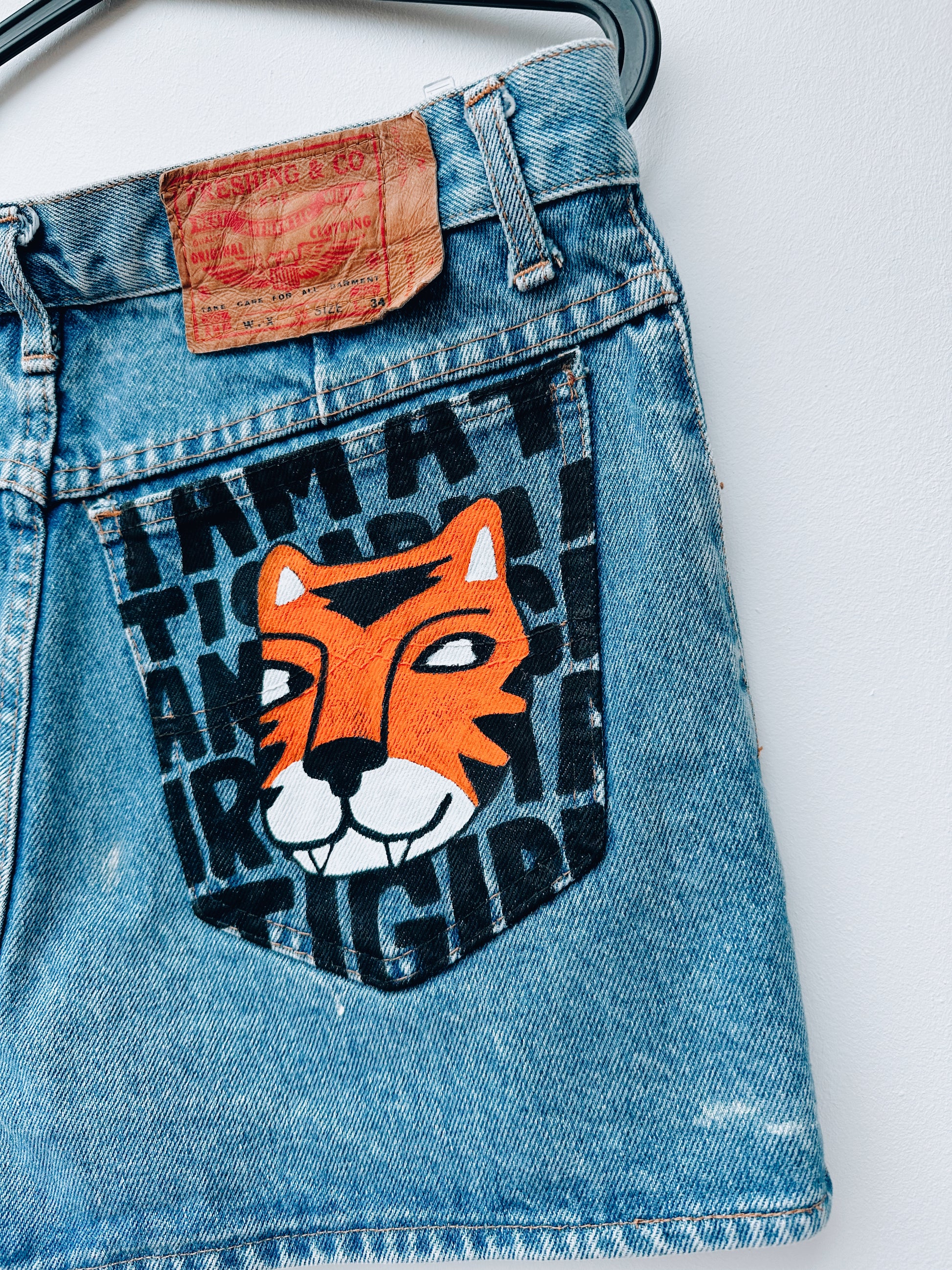 Un denim qui rugit un peu. Tigre peint à la main à l’encre textile, message assumé, poche arrière qui ne passe pas inaperçue.